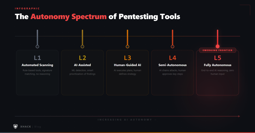 | L5: Fully Autonomous | AI handles end-to-end with no human input | XBOW, Ares, XHack AI |